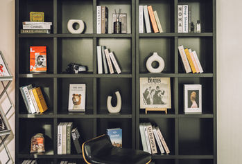 소파와 벽 선반으로 구성 된 깔끔하고 모던한 공간